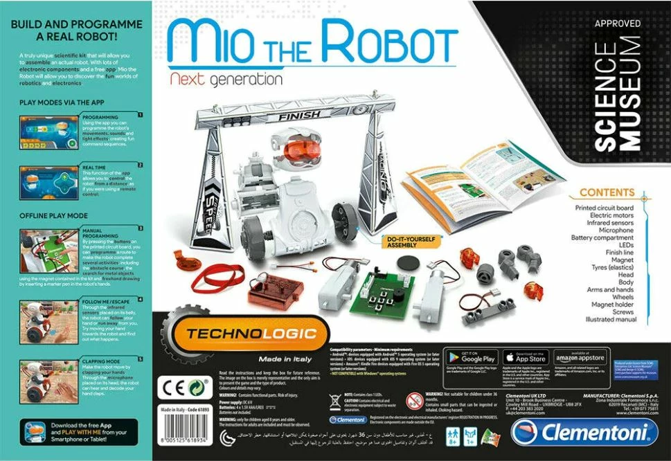 Thanks to two infrared sensors, the new Mio Robot can avoid obstacles and follow your hand like a real bloodhound. You can use the microphone to command it by simply clapping your hands, while the push-button panel on the robot’s back can be used to programme its route. The free app has two play sections: coding, to learn the principles of block-based programming, and real-time, to control movements, sounds, and light effects.