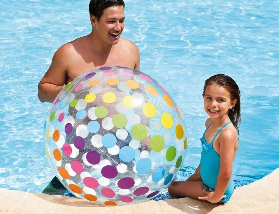 Bring big fun to the beach with the INTEX Jumbo Beach Ball! This giant 106cm (Diameter) beach ball features a classic transparent design with colorful panels. Including one repair patch, the INTEX Jumbo Beach Ball makes every outing more fun.