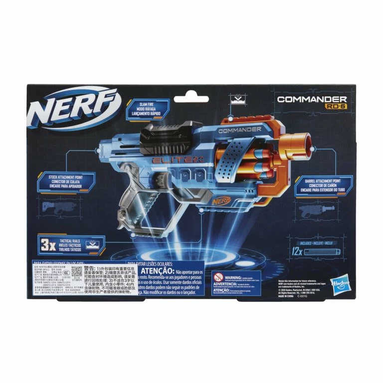 The Nerf Elite 2.0 Commander RD-6 blaster has 3 tactical rails, a barrel attachment point, and stock attachment point to customize the blaster for every Nerf game. The blaster has a 6-dart rotating drum so you can fire multiple darts before reloading. Fire 1 dart at a time, or launch all 6 darts rapidly with slam-fire action. Barrel extension and stock not included. includes 12 Official Nerf darts — enough to fully load the drum, and 6 darts to keep nearby for reloads. Eyewear recommended (not included). No batteries required.