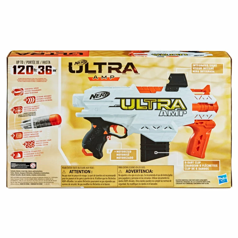 The Nerf Ultra Amp blaster features motorized dart blasting so you can fire darts fast! It comes with a removable 6-dart clip to launch 6 darts in a row. Power up the motor by holding down the acceleration button, and press the trigger to send 1 dart at a time at your targets. The Nerf Ultra Amp blaster has an integrated sight for you to align your shots. Nerf Ultra blasters take your game to the next level with their advanced design and performance that delivers extreme distance, accuracy, and speed. Nerf Ultra darts are the farthest flying Nerf darts EVER and have an innovative flight tip, Aerofin technology, and Nerf Ultra foam. Nerf Ultra blasters work only with Nerf Ultra darts. Batteries required (not included). Eyewear recommended (not included).