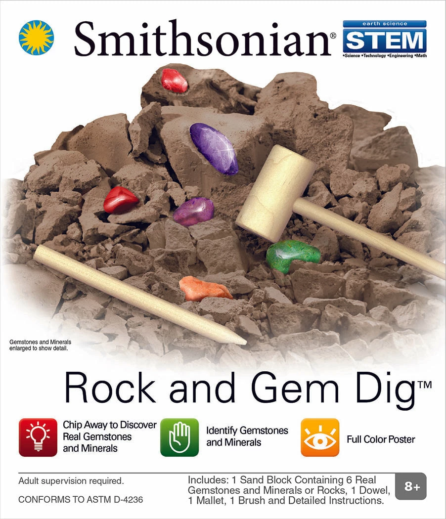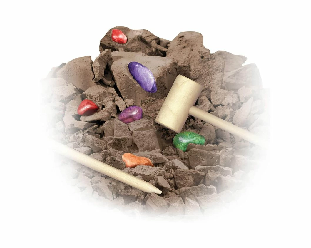 Excavate and identify gemstones and minerals! Chip away to discover real gemstones and minerals in this kit which allows little archaeologists to get a hands-on experience. Test for hardness and streaks, dig for semi precious gemstones and minerals, and identify your treasures! Kids will be amazed at what they find and learn. Perfect for any rainy day, this is a fun and engaging learning kit providing a world of adventure, discovery and wonder.