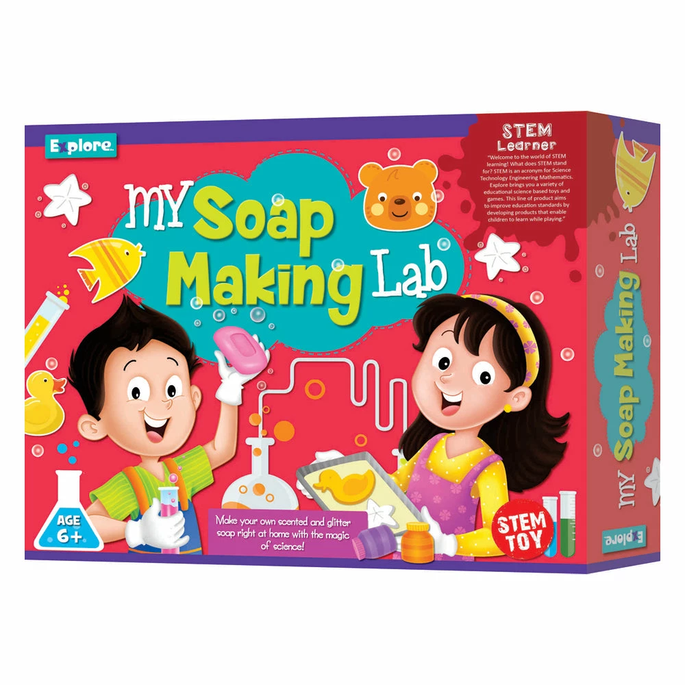In this fun packed educational toy brought to you by Explore, you will learn how to make fantastic soaps in funny shapes. You can give it the colour of your own choice. You can make soaps in a incredible fragrancves and glitter. So much to do, and all in one package! My Soap Making Lab enables you to have an amazing time while learning about liquid soaps and how to make them. You can now turn your play area into a science lab and perform numerous experiments. The package comes quipped with all the nexessary apparatus to perform experiements. With the help of some household items, you are ready to go. Learning and playing together was never this fun!