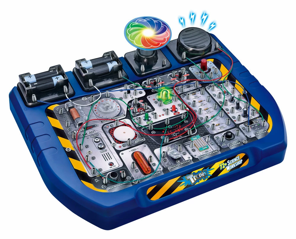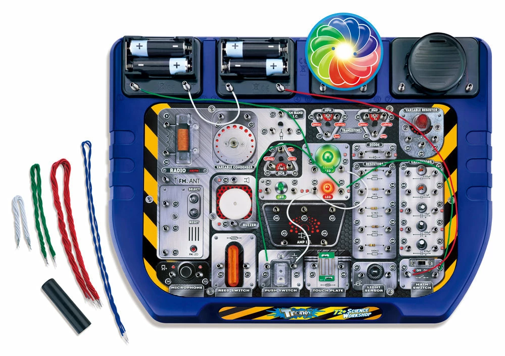 This Science Workshop features more than 72 exciting and educational experiments! Kids can interact with light, magnetic, sound, and touch control while learning realistic concepts of electronics and electricity. Activities include connecting to AM/FM radio, musical sounds, colour filters, LED lights, and many more.
