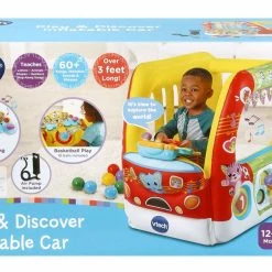 Time for driving fun with the Play & Discover Inflatable Car by VTech! Cute inflatable car with interactive driver and ball play fun! Car features shape sorter holes & cute animal designs that feature numbers, shapes & colours allowing for inside & outside play! Interactive driver unit slots into rubber notches on the car or can be used for on-the-go play. Includes 2 accessories that can be attached to the driver or car for more fun play. Driver features horn button, ignition switch & accelerator. 5 light up buttons & 3 modes of play teach animals, shapes & numbers. In Explore Mode children can ‘drive’ to different locations with the animal friends! Includes 10 balls for ball pool play & the steering wheel drops down for basketball play. Motion sensor will activate if children move within the main car to trigger fun sounds. Includes foot pump.
