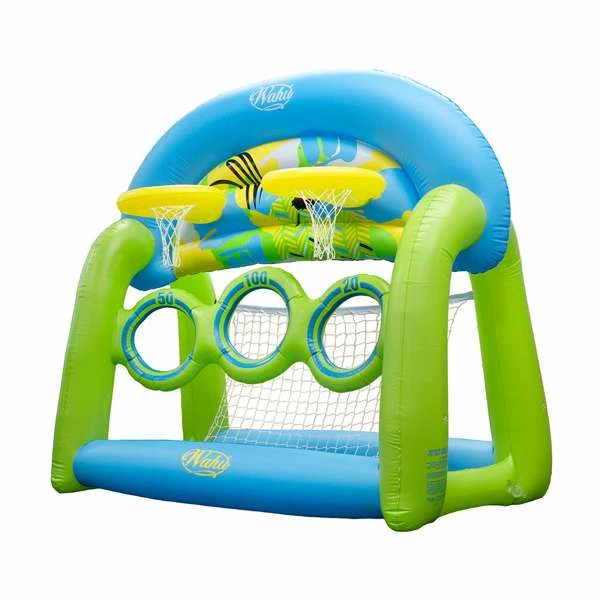 This large, multi-functional inflatable (Measuring approx. 150cm x 145cm x 86cm when inflated), can be used both in and out of the pool! Featuring 2 basketball hoops, 3 circular skim scoring targets, a detachable net on the rear plus an 11cm ball, you’ll be all set for summer! Ideal for unlimited rounds of pool basketball challenges, water polo, pool football/soccer or skim ball challenges!